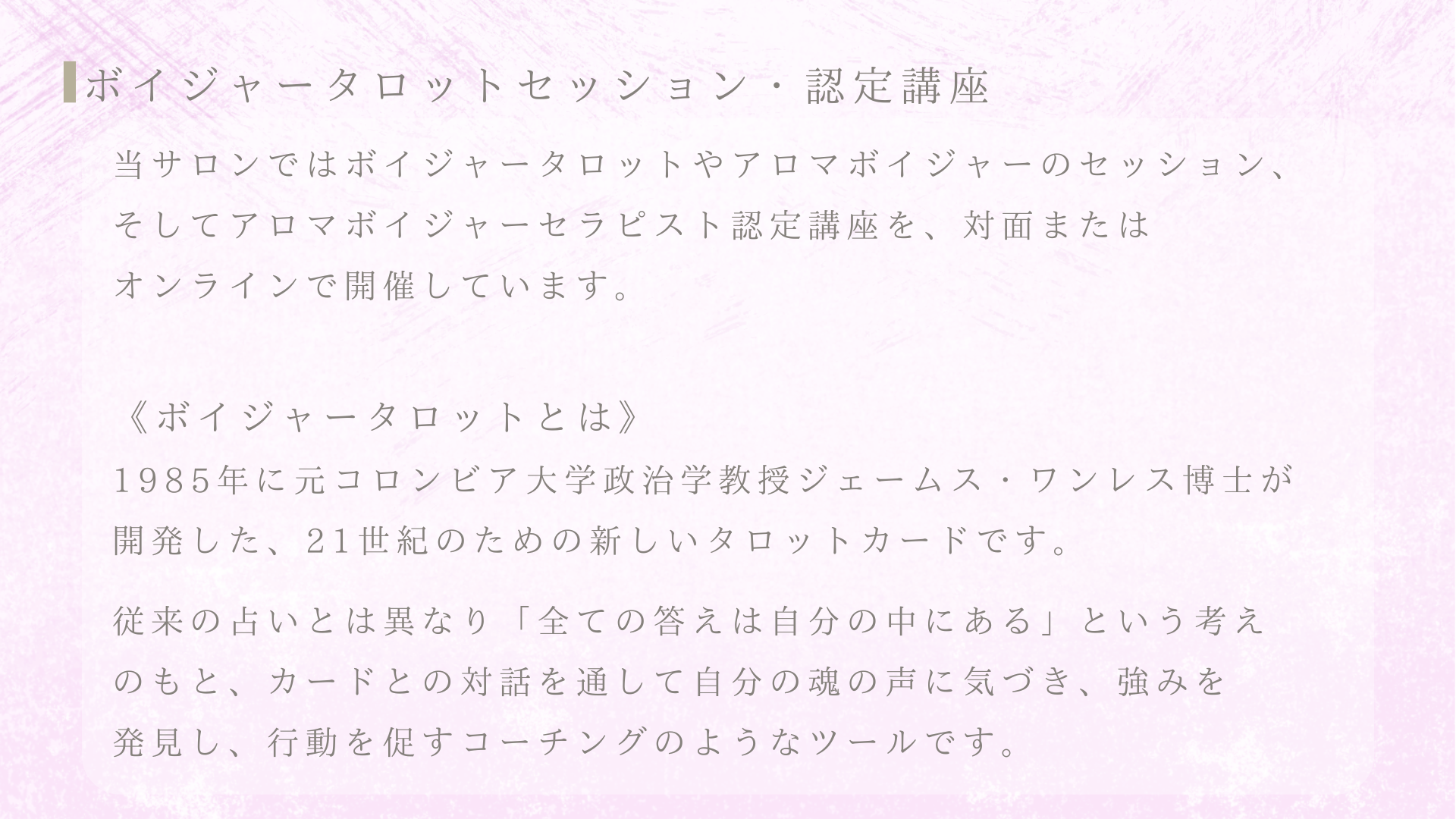 さまざまな角度から潜在意識にアプローチし、心・体・魂を整えるヒーリングサロンです。